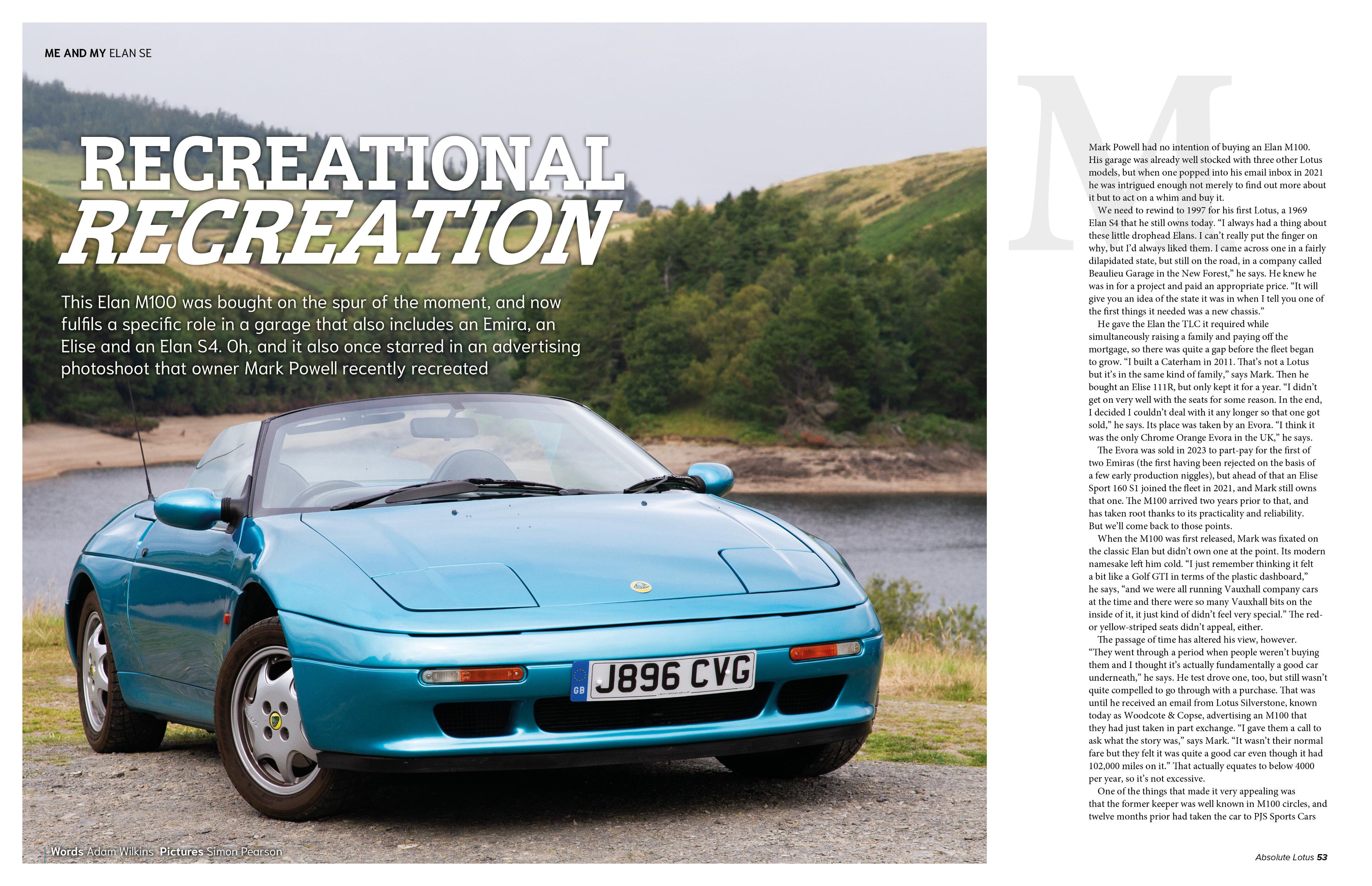 Mark Powell hadn’t set out to buy an Elan M100 when this one popped into his email inbox. He already had a classic Elan and a modern Lotus in the garage, but there was something about the M100 that intrigued him. It was being offered at a bargain price and had receipts for lots of recent work the convinced him he wasn’t taking a gamble. It was also the very car that appeared in Lotus’s marketing materials when the car was new, so Mark recently retraced its steps and went back to the same Welsh reservoir to recreate the image.