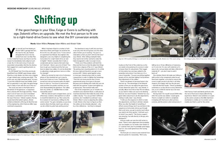 If the gearchange in your Lotus Elise, Exige or Evora isn’t feeling as fresh as it once did, the aftermarket is here to help get it back to feeling factory fresh. One offering comes from Italian company Dolomiti, and Evora owner Alistair Fuller was the first person to fit the kit to a right-hand-drive Evora. While it looks complicated, breaking the job down to a step by step process meant he was able to complete the job in his garage.