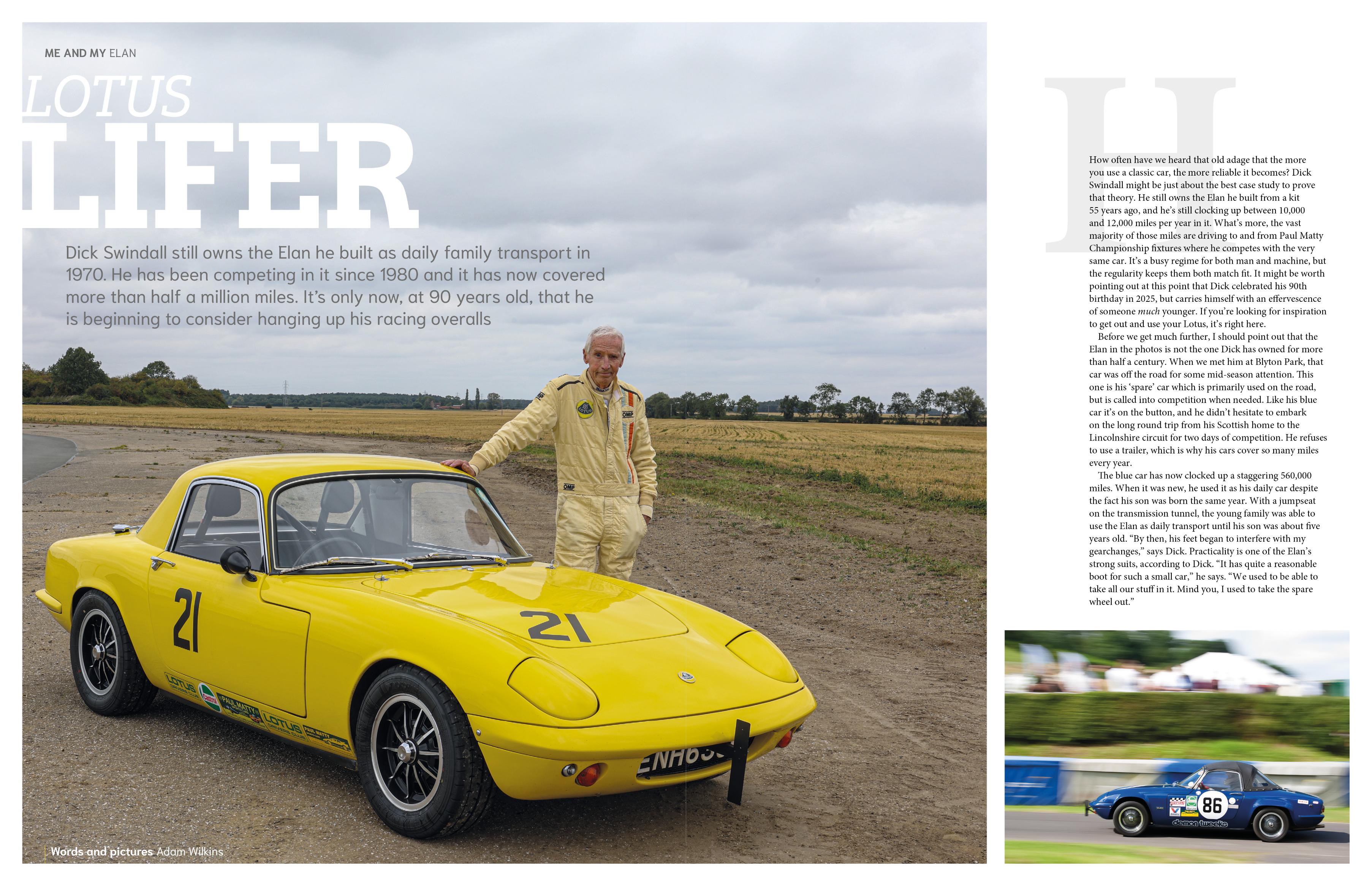 It’s no exaggeration to call Dick Swindall a Lotus lifer. He bought his first Elan new in 1970, and saved the purchase tax by building it himself. It was his daily driver for five years, until his son was too tall to sit between the seats (“His feet began to interfere with the gearlever,” says Dick). In 1980, he started hillclimbing and still competes in the car every year. It has clocked up more than 560,000 miles, a total that’s increasing every year. The yellow car here is a second Elan, bought in 2000, that’s primarily a road car. His remarkable story is in the new issue of Absolute Lotus.