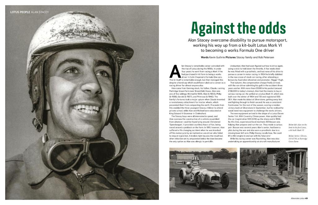 A Lotus Eleven provided that competitive edge which set him on a path towards being a professional driver. In Issue 49, Stacey’s biographer Kevin Guthrie tells the story of how made the ascent all the way to being a Lotus works driver in Formula One.