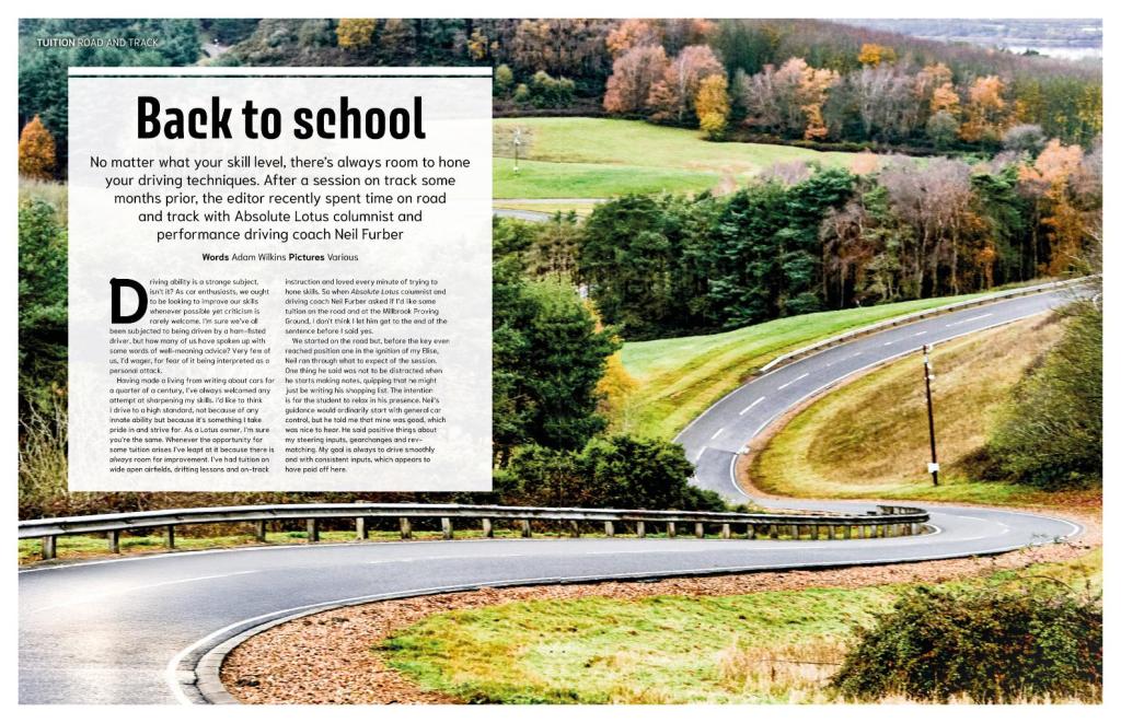 But like any skill, driving can be developed and honed, and that process is only accelerated with some professional intervention. In Issue 49, the editor spent time on road and track with Absolute Lotus columnist and driving coach Neil Furber.
